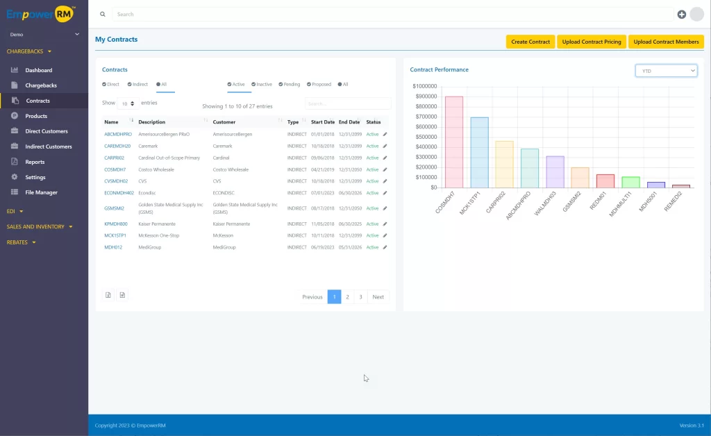 Built on the most advanced web technologies that exist today, we proudly deliver ground-breaking contract management software that manages the contract and the complete pricing history. Utilizing EmpowerRM’s cutting-edge software, you can now easily manage all of your contracts with retail chains, wholesalers, and GPO’s. Plus, you are able to keep a full price history of each product on each contract for reporting and chargeback processing.